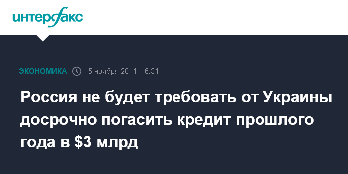 Москва. 15 ноября. INTERFAX.RU - Президент РФ Владимир Путин заявил, что Россия не будет предъявлять к Украине требования досрочно погасить прошлогодний кредит в 3 млрд долларов, если ее общий долг превысит 60% ВВП.