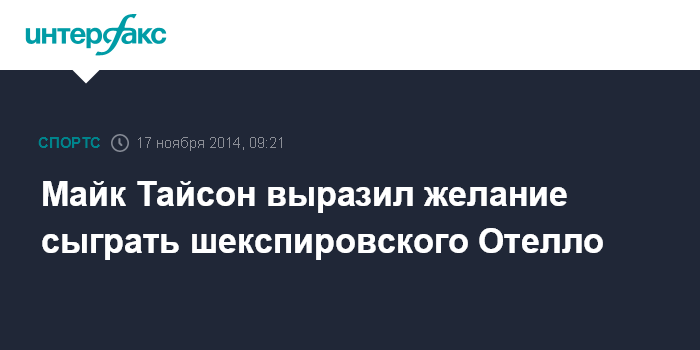 Москва. 17 ноября. INTERFAX.RU - Легендарный американский боксер Майк Тайсон выразил желание сыграть Отелло в экранизации пьесы Уильяма Шекспира.