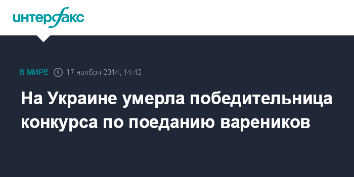 Москва. 17 ноября. INTERFAX.RU - В райцентре Стрый Львовской области Украины победительница конкурса по поеданию вареников умерла на сцене во время награждения, сообщили агентству "Интерфакс" в отделе связей с общественностью областного ГУМВД.