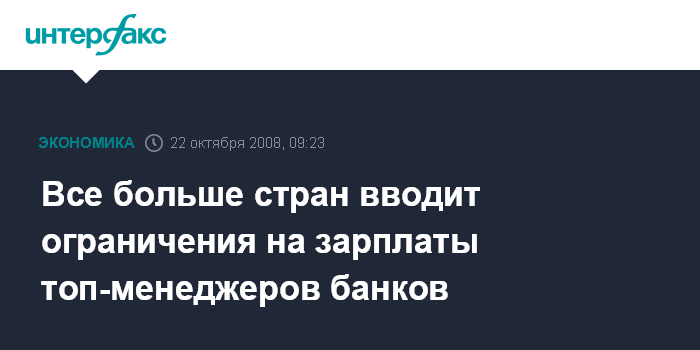 Москва. 22 октября. INTERFAX.RU - Количество стран, вводящих ограничения на зарплаты топ-менеджеров банков, участвующих в правительственных программах по поддержке финансовой системы, увеличивается. В понедельник в их число вошли Германия и Швеция, пишет газета The Wall Street Journal.