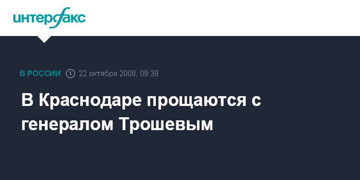 Москва. 22 октября. INTERFAX.RU - В Краснодаре в среду проходит церемония прощания с генералом Геннадием Трошевым, погибшим в сентябре в авиакатастрофе пассажирского самолета "Боинг-737" в Перми.