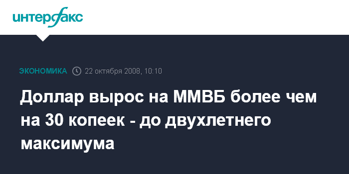 Москва. 22 октября. INTERFAX.RU - Доллар вырос в первую минуту торгов ММВБ в среду (начинаются в 10:00 мск) до 26,91 руб./$1, на 32 копейки к закрытию вторника, обновив максимум с лета 2006 года.