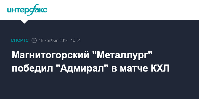 Москва. 18 ноября. INTERFAX.RU - В матче очередного тура регулярного чемпионата Континентальной хоккейной лиги (КХЛ) магнитогорский "Металлург" во Владивостоке взял верх над местным ХК "Адмирал".