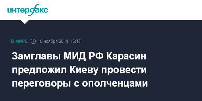 Москва. 18 ноября. INTERFAX.RU - Киев должен вести переговоры по урегулированию украинского кризиса не с Москвой, а с ополченцами с юго-востока Украины, заявил "Интерфаксу" замглавы МИД РФ Григорий Карасин.
