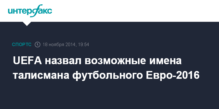 Москва. 18 ноября. INTERFAX.RU - Союз европейских футбольных ассоциаций озвучил возможные имена талисмана чемпионата Европы по футболу 2016 года.