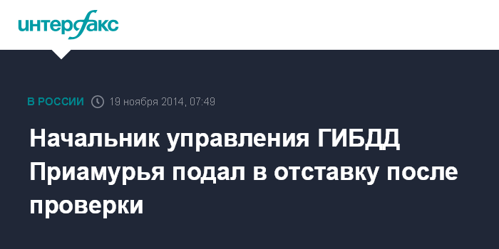 Москва. 19 ноября. INTERFAX.RU - Начальник управления ГИБДД по Амурской области подал рапорт об увольнении после проверки его подразделения комиссией МВД России, сообщается на сайте УМВД по Амурской области.