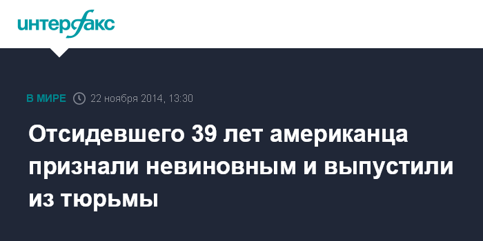 Москва. 22 ноября. INTERFAX.RU - Приговоренный к пожизненному заключению американец Рики Джексон, который провел в тюрьме 39 лет в ожидании исполнения приговора, в пятницу был освобожден в зале суда. Как сообщает France 24, было доказано, что 57-летний мужчина был осужден за преступление, которого не совершал.