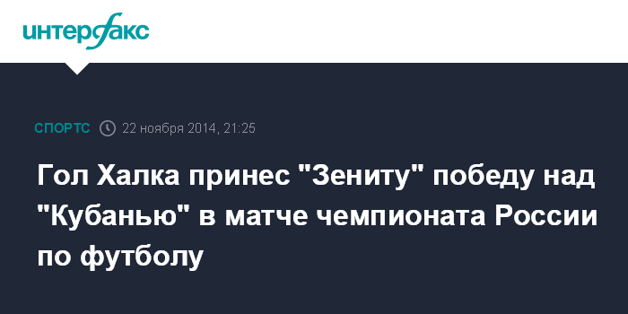 Москва. 22 ноября. INTERFAX.RU - Футболисты "Зенита" со счетом 1:0 обыграли "Кубань" в поединке 14-го тура премьер-лиги, который состоялся в субботу в Петербурге.