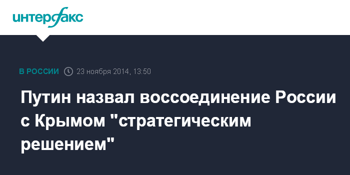 Москва. 23 ноября. INTERFAX.RU - Президент России Владимир Путин заявил, что в ситуации с Крымом было принято стратегическое решение и подчеркнул, что уверен в своей правоте.