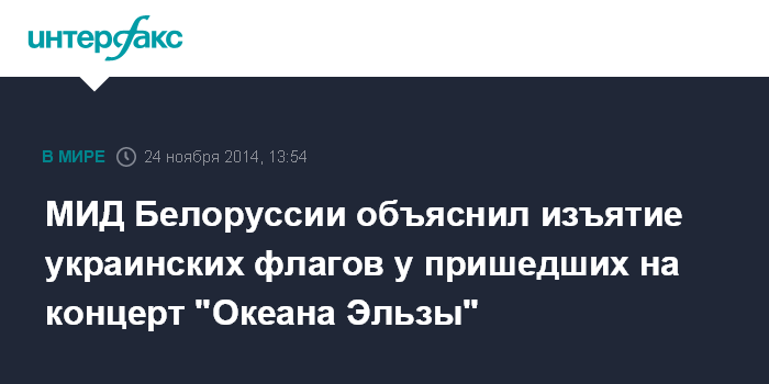 Москва. 24 ноября. INTERFAX.RU - Изъятие у зрителей на концерте украинской группы "Океан Эльзы" в Минске украинских государственных флагов производилось исключительно в целях заботы о зрителях, отмечают в министерстве иностранных дел Беларуси.