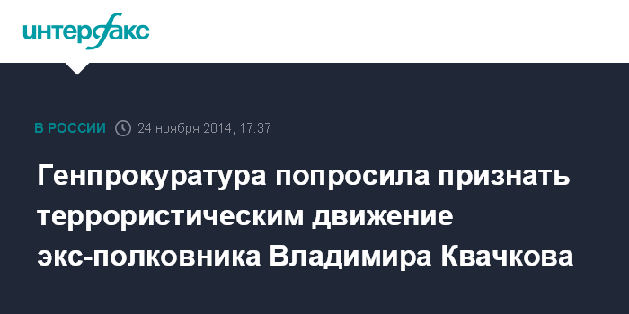 Москва. 24 ноября. INTERFAX.RU - Генпрокуратура РФ просит суд признать террористическим движение "Народное ополчение имени Минина и Пожарского", лидером которого был полковник ГРУ Владимир Квачков, отбывающий наказание по делу об экстремизме, сообщили "Интерфаксу" в понедельник в пресс-службе Мосгорсуда.