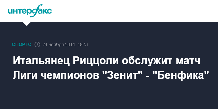 Москва. 24 ноября. INTERFAX.RU - На матч пятого тура группового этапа Лиги чемпионов УЕФА между петербургским "Зенитом" и португальской "Бенфикой" назначены итальянская бригада арбитров во главе с Николой Риццоли, сообщает сайт УЕФА.