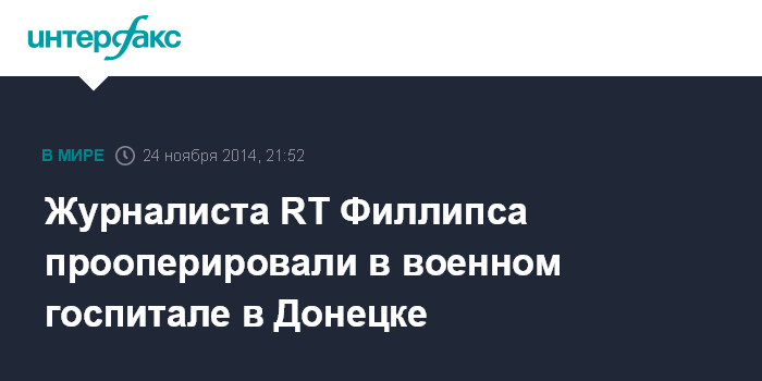 Москва. 24 ноября. INTERFAX.RU - Британский журналист Грэм Филлипс, получивший легкое осколочное ранение под Донецком, успешно прооперирован, сообщается в понедельник в твиттере "ДНР Новороссия".