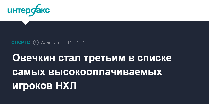 Москва. 25 ноября. INTERFAX.RU - Российский хоккеист клуба НХЛ "Вашингтон" Александр Овечкин стал третьим в списке самых высокооплачиваемых игроков лиги, свидетельствуют данные Forbes.