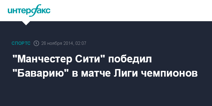 Москва. 26 ноября. INTERFAX.RU - В матче пятого тура группового этапа Лиги чемпионов УЕФА "Манчестер Сити" на своем поле в Англии одержал победу над немецкой "Баварией".