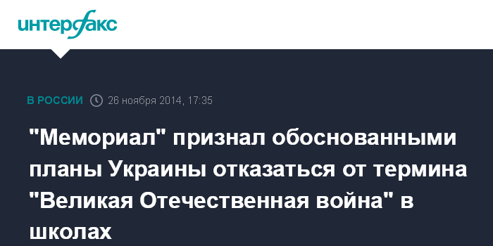 Москва. 26 ноября. INTERFAX.RU - Планы Минобразования Украины заменить формулировку "Великая Отечественная война" на "Вторую мировую войну" частично обоснованы. Об этом заявил "Интерфаксу" историк и правозащитник, руководитель общества "Мемориал" Арсений Рогинский.