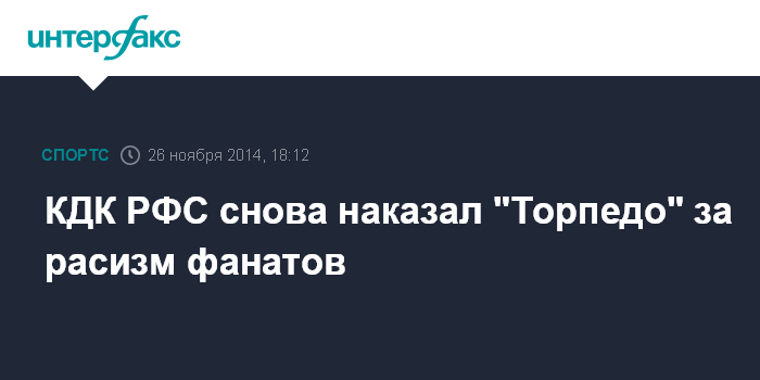 Москва. 26 ноября. INTERFAX.RU - Контрольно-дисциплинарный комитет РФС наказал московское "Торпедо" проведением ближайших трех домашних матчей с закрытой фанатской трибуной, сообщает пресс-служба Российского футбольного союза.