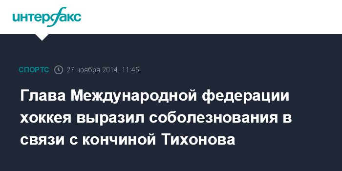 Москва. 27 ноября. INTERFAX.RU - Президент Международной федерации хоккея (IIHF) Рене Фазель принес официальные соболезнования в связи со смертью легендарного отечественного тренера Виктора Тихонова.