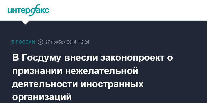 Москва. 27 ноября. INTERFAX.RU - В Госдуму внесен законопроект, который определяет процедуру признания нежелательной деятельности на территории России иностранных и международных организаций, представляющих угрозу основам конституционного строя страны и ее безопасности.
