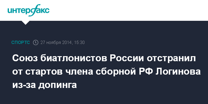Москва. 27 ноября. INTERFAX.RU - Союз биатлонистов России (СБР) официально объявил об отстранении члена сборной страны Александра Логинова в связи с обнаружением в организме спортсмена запрещенного препарата, сообщает в четверг пресс-служба СБР.
