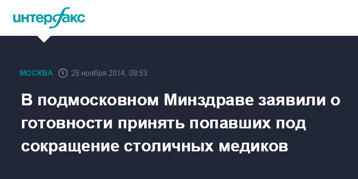 Москва. 28 ноября. INTERFAX.RU - В Московской области работает уже более 170 медработников, попавших под сокращение в Москве; в лечебно-профилактических учреждениях региона ждут врачей различных специальностей и средний медперсонал, сообщает областной Минздрав.
