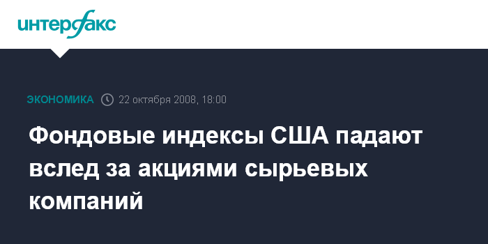Нью-Йорк. 22 октября. INTERFAX.RU - Фондовые индексы США снижаются в среду второй день подряд вслед за акциями сырьевых компаний, сообщает агентство Bloomberg.