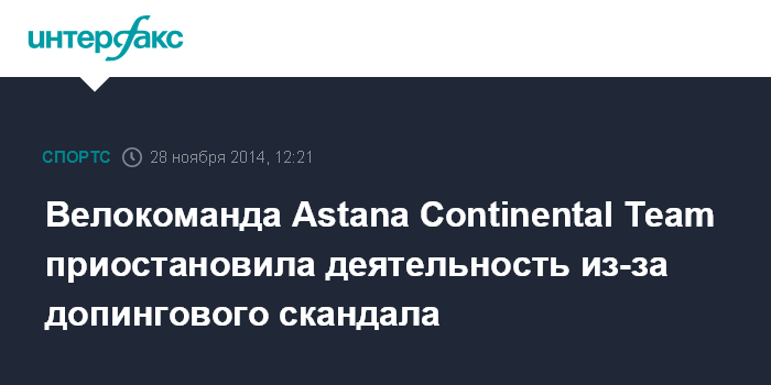 Москва. 28 ноября. INTERFAX.RU - Руководство федерации велоспорта Казахстана приняло решение приостановить деятельность профессиональной команды Astana Continental Team на время внутреннего расследования случаев применения допинга велогонщиками команды, сообщила пресс-служба федерации. Генеральный менеджер команды Дмитрий Седун отстранен от своей должности.
