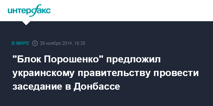 Москва. 28 ноября. INTERFAX.RU - Фракция "Блок Петра Порошенко" выступила за то, чтобы одно из первых заседаний нового правительства состоялось в зоне силовой операции на востоке Украины.