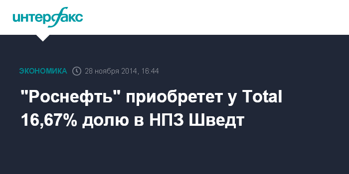 Москва. 28 ноября. INTERFAX.RU - "Роснефть" приобретет у Total 16,67% долю в нефтеперерабатывающем заводе в немецком городе Шведт (PCK Raffinerie GmbH). Как сообщила российская компания, стороны подписали основные условия сделки.Подписи под документами в Сочи поставили глава "Роснефти" Игорь Сечин и главный исполнительный директор Total Патрик Пуянне.