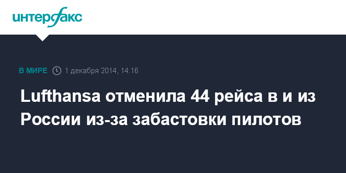 Москва. 1 декабря. INTERFAX.RU - Немецкая авиакомпания Lufthansa отменяет 44 рейса в и из РФ из-за начавшейся в понедельник двухдневной забастовки пилотов, сообщили "Интерфаксу" в компании.