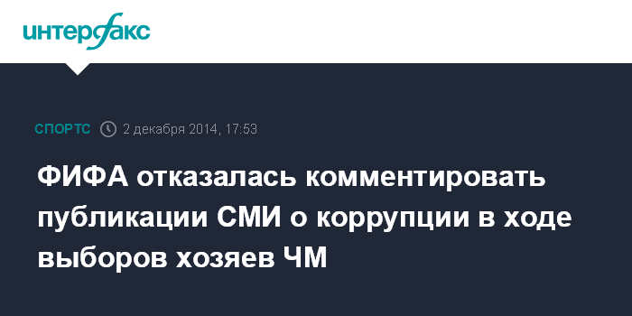 Москва. 2 декабря. INTERFAX.RU - Международная федерация футбола (ФИФА) отказалась от комментариев публикации Sunday Times о подкупе членов исполкома организации при выборе стран-хозяек ЧМ-2018 и ЧМ-2022 России и Катара, соответственно.