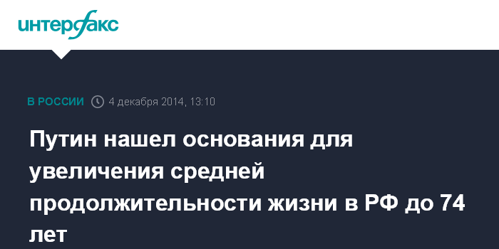 Москва. 4 декабря. INTERFAX.RU - Средняя продолжительность жизни в России в ближайшей перспективе может увеличиться до 74 лет, заявил президент РФ Владимир Путин.