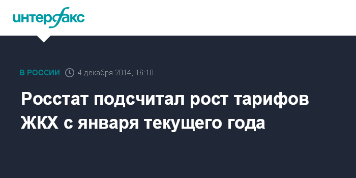 Москва. 4 декабря. INTERFAX.RU - Тарифы на жилищно-коммунальные услуги в России в ноябре 2014 года выросли на 1,9% после повышения на 1,0% в октябре, на 0,6% в сентябре и в августе, на 2,8% в июле, на 0,3% в июне, на 0,8% в мае, нулевого роста в апреле, роста на 0,2% в марте, на 0,1% в феврале и на 0,2% в январе, сообщила в четверг Федеральная служба государственной статистики (Росстат).