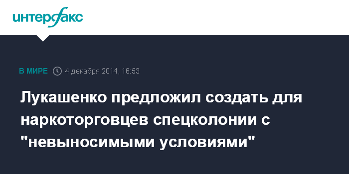 Москва. 4 декабря. INTERFAX.RU - Президент Белоруссии Александр Лукашенко предложил отправлять осужденных за преступления, связанные с наркотиками, в спецколонии и создавать там невыносимые условия, чтобы "смерти просили".