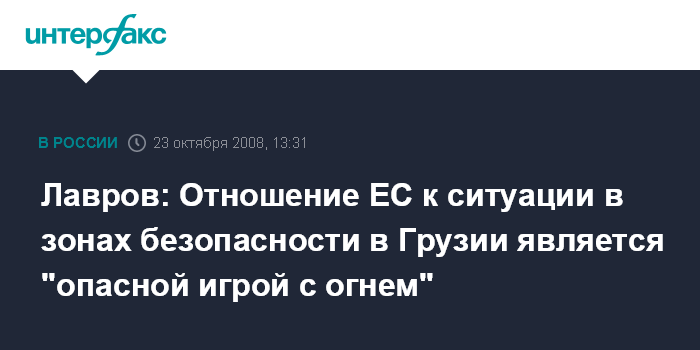 "Не будем забывать, что Евросоюз выступает гарантом неприменения силы против Южной Осетии и Абхазии. И такое легкое отношение к тому, что в этих зонах вокруг Южной Осетии и Абхазии происходит, оно нас настораживает - это, в общем-то, опасная игра с огнем", - заявил С.Лавров на брифинге в Москве.