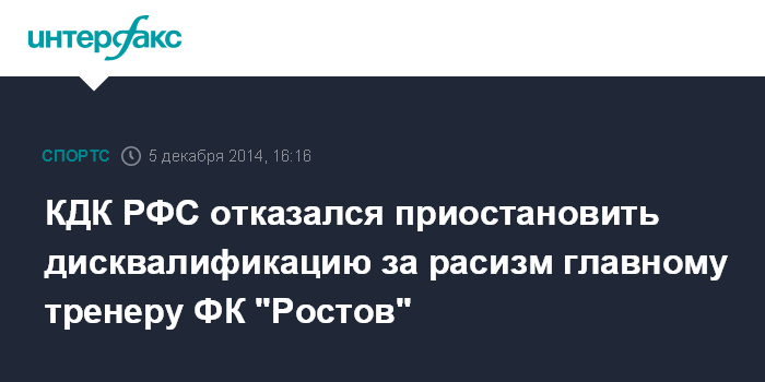 КДК РФС отказался приостановить дисквалификацию за расизм главному тренеру ФК "Ростов"