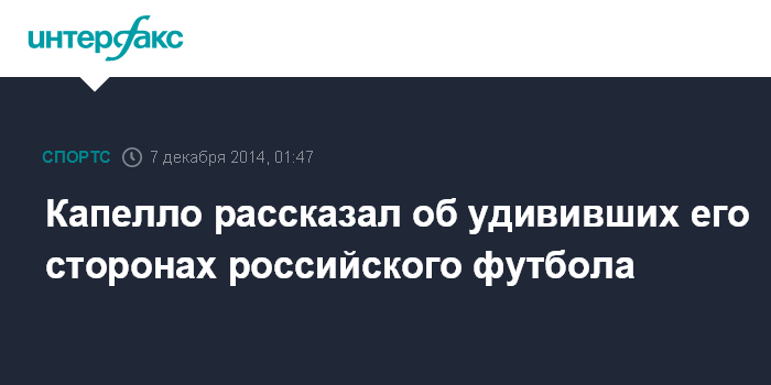 "Для меня в российском футболе, когда я туда перебрался, открытием стали две или три вещи. Во-первых, это всего 16 клубов в премьер-лиге. Этого мало. Во-вторых, лимит на легионеров. Здесь допускается присутствие только четырех российских игроков на поле. Это было большим сюрпризом для меня. Потому что в Европе немецкие, итальянские, испанские футболисты могут играть повсюду, и у тренера богатый выбор. Наконец, удивило малое число зрителей на стадионах. Однако на аренах, которые готовятся к чемпионату мира-2018, уже созданы более комфортные условия, так что ситуация налаживается, туда приходят больше болельщиков", - цитирует французское издание L'Equipe Капелло.