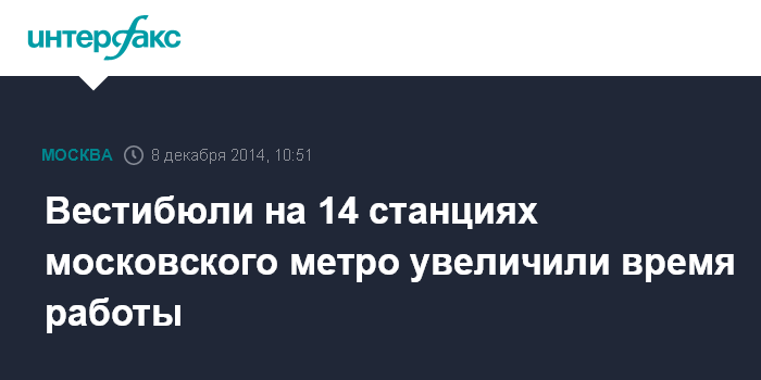 Москва. 8 декабря. INTERFAX.RU - С понедельника увеличилось время работы вестибюлей на 14 станциях москвского метро, сообщает издание m24.ru.