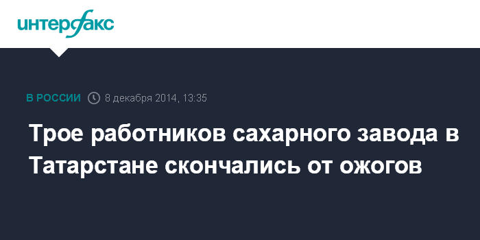 Москва. 8 декабря. INTERFAX.RU - Трое рабочих, получившие в конце прошлой недели серьезные ожоги на сахарном заводе в Заинске (Татарстан), скончались в больнице.