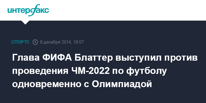 Москва. 9 декабря. INTERFAX.RU - Президент Международной федерации футбола (ФИФА) Йозеф Блаттер заявил, что отрицательно относится к перспективе проведения чемпионата мира 2022 года в одно время с зимней Олимпиадой.