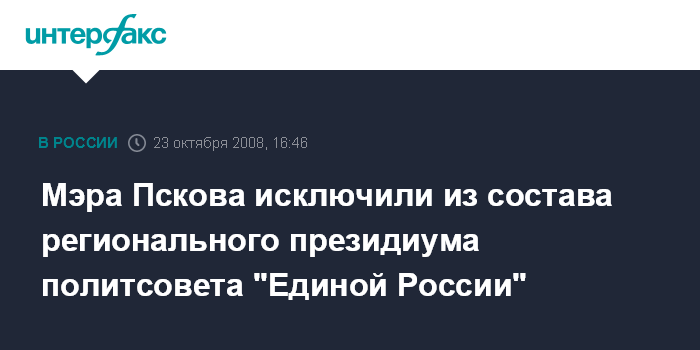 По его словам, решение исключить мэра Пскова из состава президиума приняли в четверг делегаты второго этапа конференции регионального отделения партии в связи с неудовлетворительным выполнением им обязанностей, связанных с налаживаем бесперебойной работы жилищно-коммунального хозяйства города.