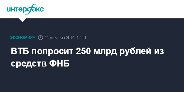 Москва. 11 декабря. INTERFAX.RU - ВТБ рассчитывает получить из средств ФНБ не более 250 млрд рублей.