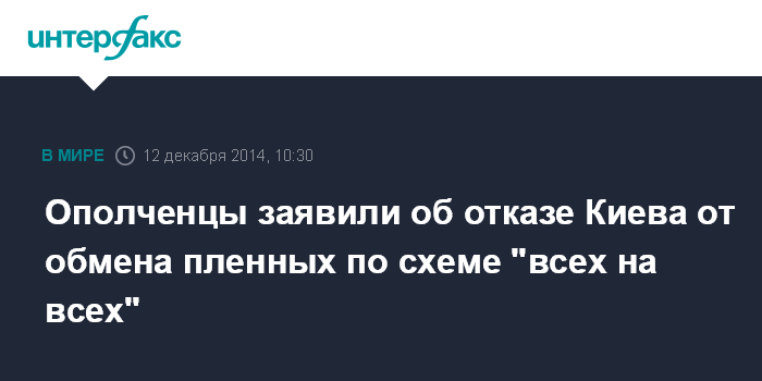 Москва. 12 декабря. INTERFAX.RU - Руководство самопровозглашенной Донецкой народной республики обвинило Киев в срыве очередной попытки обменять пленных в формате "всех на всех".