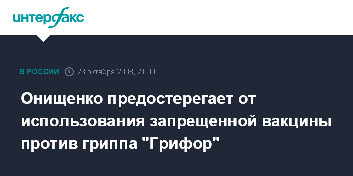 Москва. 23 октября. INTERFAX.RU - Использование вакцины против гриппа под названием "Грифор" запрещено, заявил глава Роспотребназдора, главный государственный врач РФ Геннадий Онищенко.