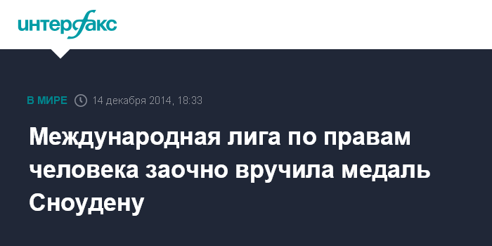 Москва. 14 декабря. INTERFAX.RU - Бывший сотрудник АНБ и ЦРУ США Эдвард Сноуден заочно удостоен Медали имени Карла фон Осецкого, сообщает в воскресенье германская телерадиокомпания "Немецкая волна".