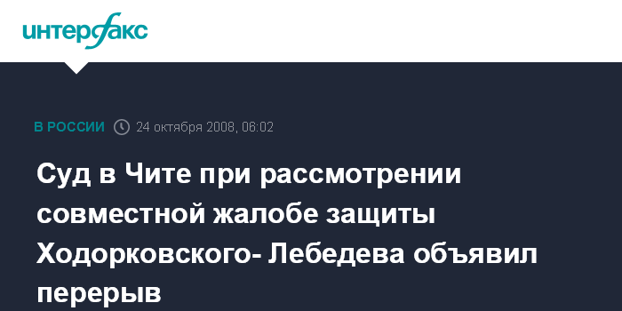Чита 24 октября. ИНТЕРФАКС-СИБИРЬ - Ингодинский районный суд города Читы при рассмотрении совместной жалобы защиты бывшего главы НК "ЮКОС" Михаила Ходорковского и бывшего руководителя МФО "МЕНАТЕП" Платона Лебедева на действия следователей объявил перерыв.