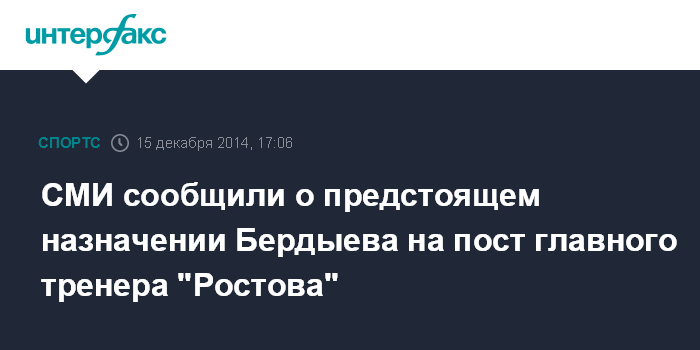 Бердыев находится без работы с декабря 2013 года. До этого он на протяжении 12 лет возглавлял казанский "Рубин", с которым дважды становился чемпионом России.