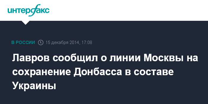 Москва. 15 декабря. INTERFAX.RU - Москва является единственной силой, выступающей за сохранение Донбасса в составе Украины при урегулировании кризиса, заявил глава МИД РФ Сергей Лавров в интервью "Интерфаксу".