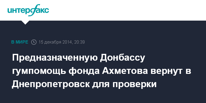 Ранее в понедельник координатор гуманитарного штаба при фонде Римма Филь заявила, что бойцы добровольческого батальона "Днепр-1" отказываются пропускать 22 грузовых автомобиля с гуманитарной помощью фонда Рината Ахметова в Донецк. Она отметила, что гуманитарная помощь Фонда предоставляется пенсионерам в возрасте от 60 лет, инвалидам, а также детям в возрасте до 2 лет.