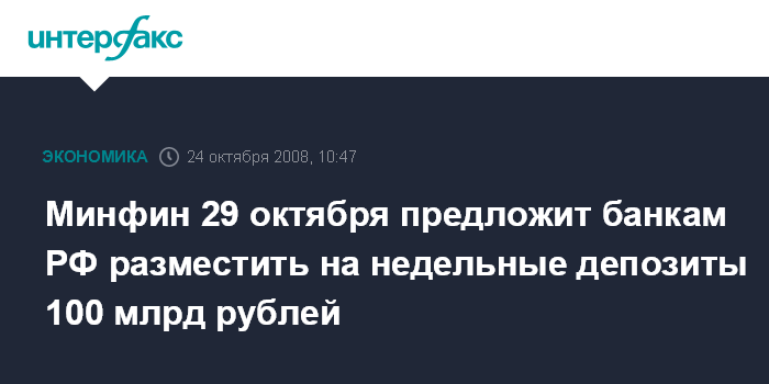 Минфин 29 октября предложит банкам РФ разместить на недельные депозиты 100 млрд рублей